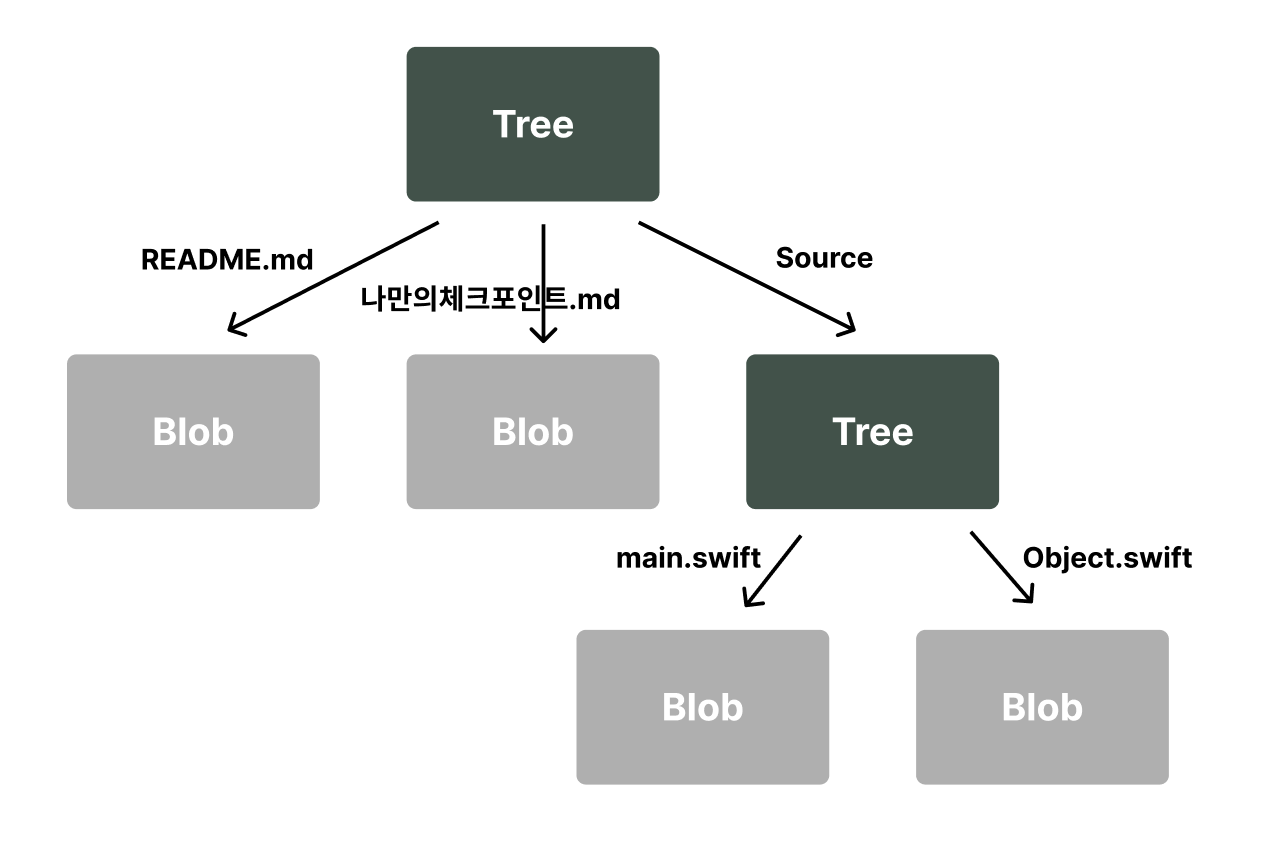 Tree 객체는 파일 시스템과 비슷한 방법으로 저장된다. 트리 객체는 Blob객체와 Tree객체를 포함한다. 이때 파일 이름을 저장한다. 따라서 Blob의 해시값과 파일명, 또는 또 다른 Tree의 해시값과 디렉토리명이 담겨있다.