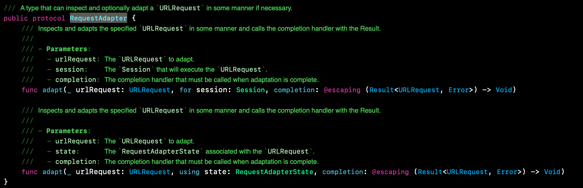 func adapt(_ urlRequest: URLRequest, for session: Session, completion: @escaping (Result<URLRequest, Error>) -> Void) {