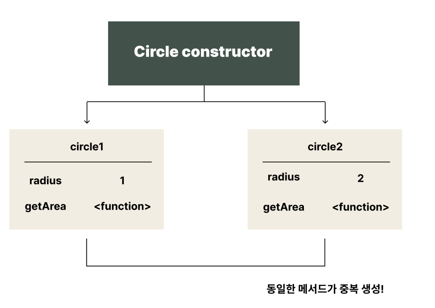 생성자 함수 내의 메서드를 각각 갖는다는 것입니다. 즉, 동일한 메서드가 2개 생기게 되는 것입니다.