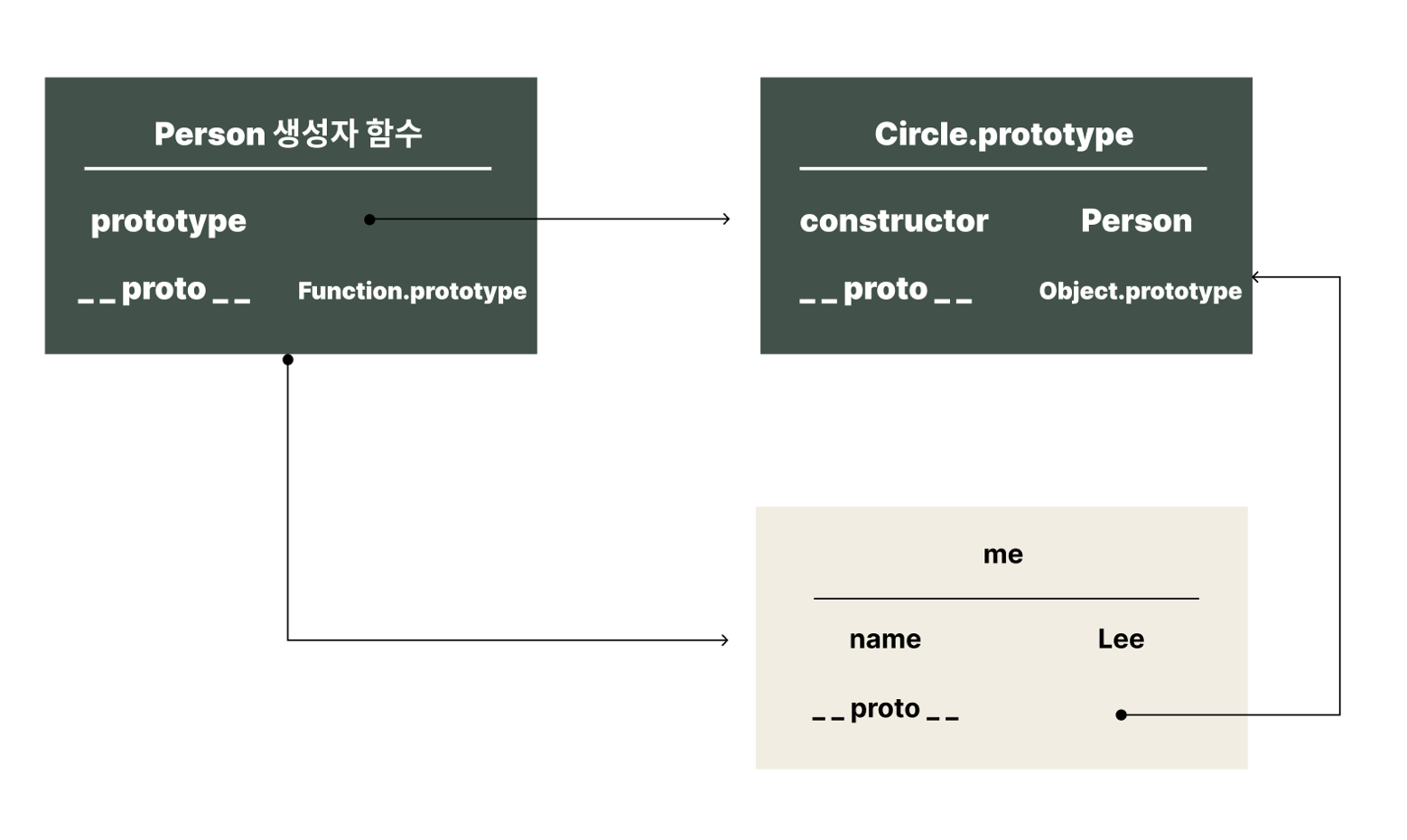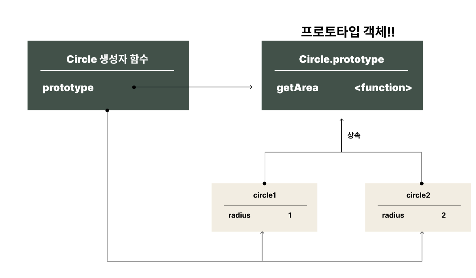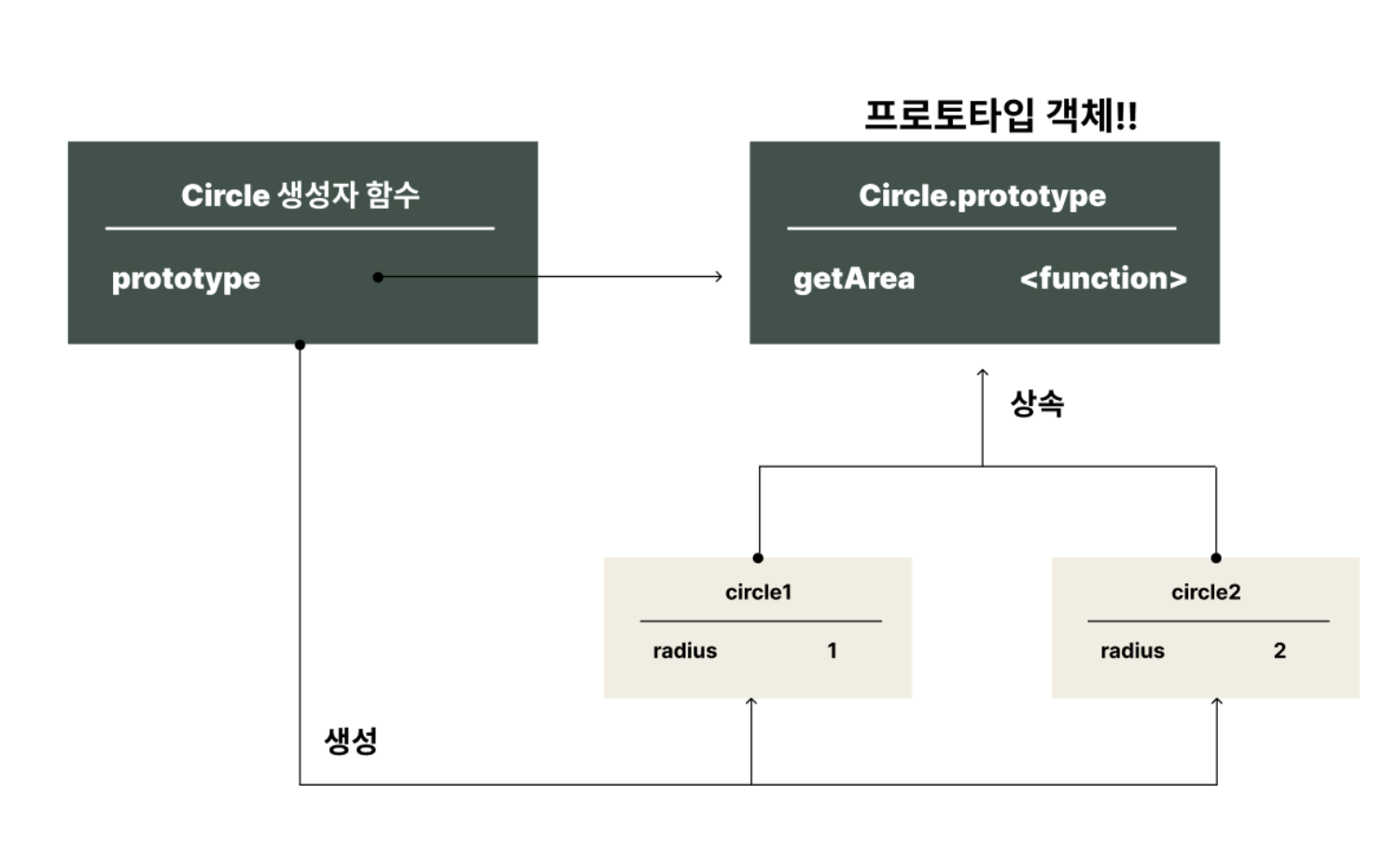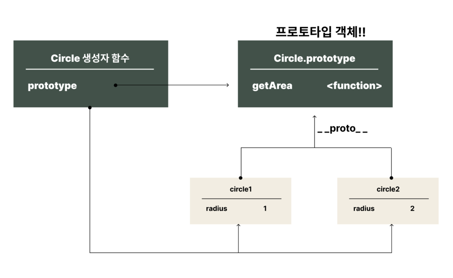 생성자 함수가 프로토타입 객체와 연결되어있고 Circle 생성자 함수로 생성한 객체들은 프로토타입 객체를 참조하고 있습니다.